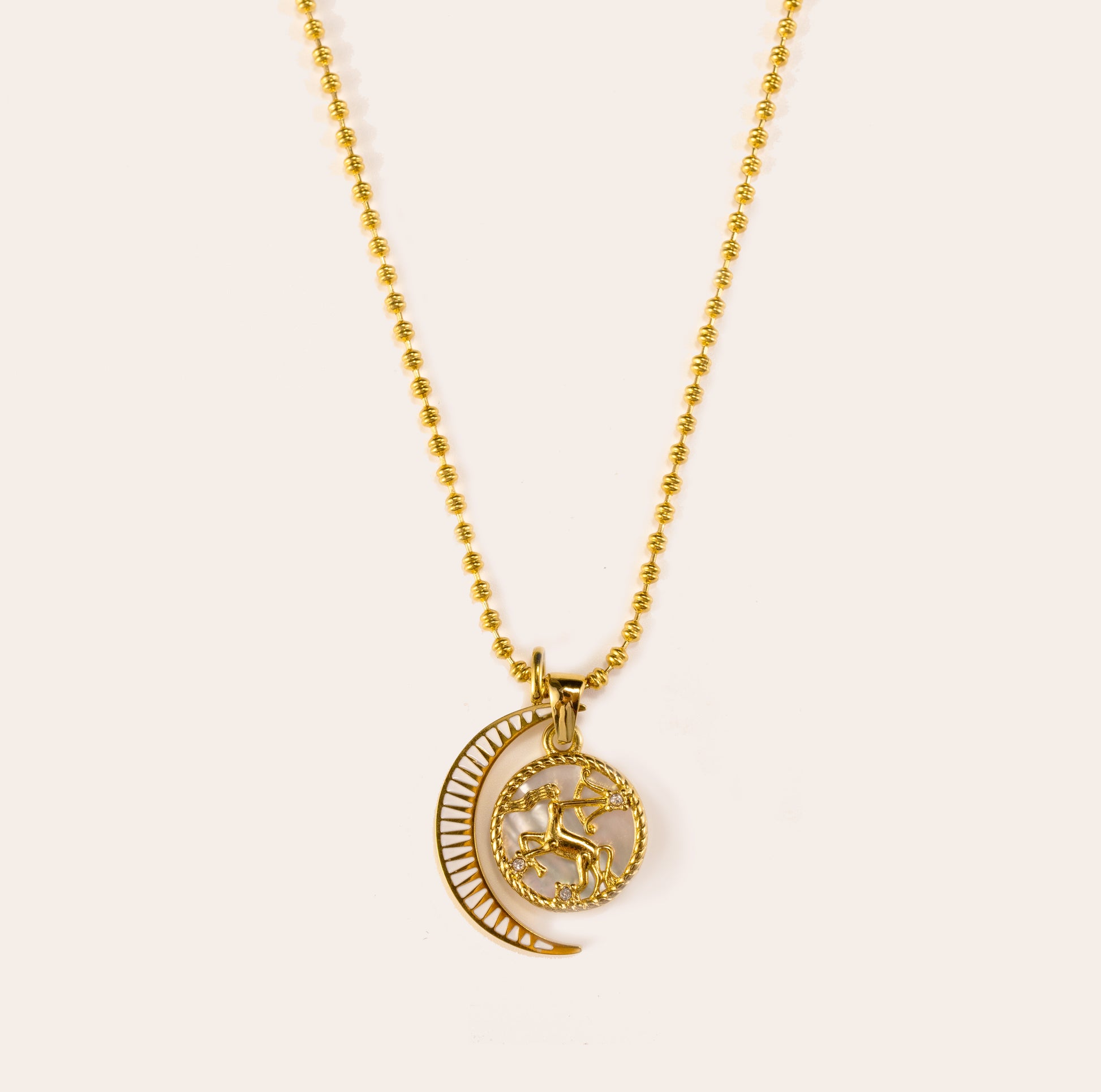 A crescent moon meets your zodiac in luminous mother of pearl. This Lunara edition pairs a pavé zodiac coin with a slim moon charm on a sleek bead (ball) chain, crafted in 18K gold plated stainless steel. The core is electropolished before plating for a smoother surface and richer color. Waterproof, sweat-resistant, and hypoallergenic, made for daily wear and easy stacking. Personalized / Custom: choose your zodiac, chain style, and adjustable length.