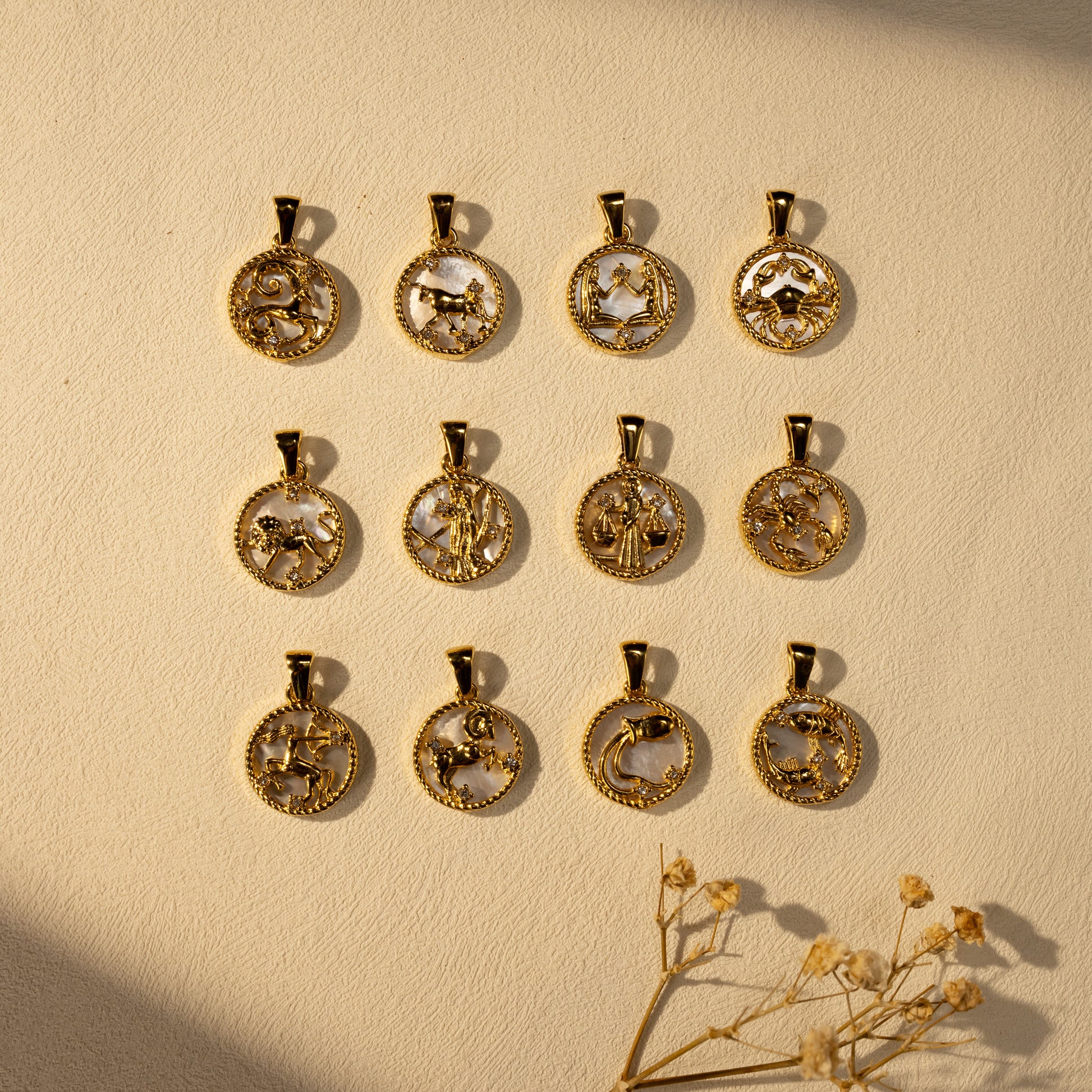 Zodiac coin 0.65“ diameter (1.64 cm) + cubic zirconia accents Moon charm 1.04 × 0.41” (2.65 × 1.05 cm) mother of pearl-