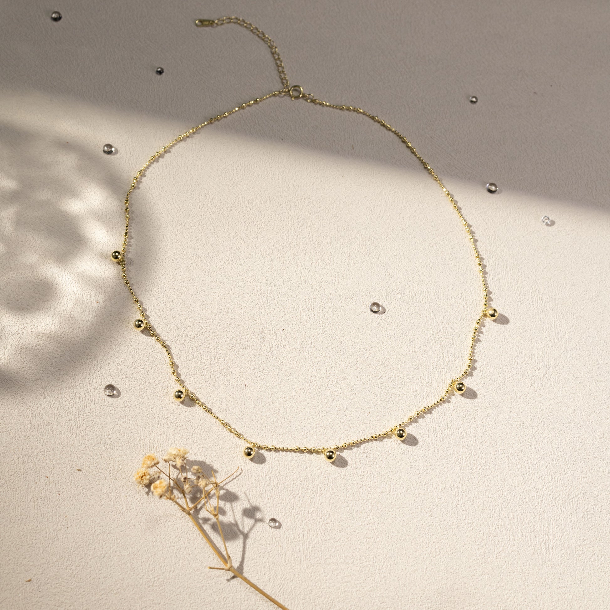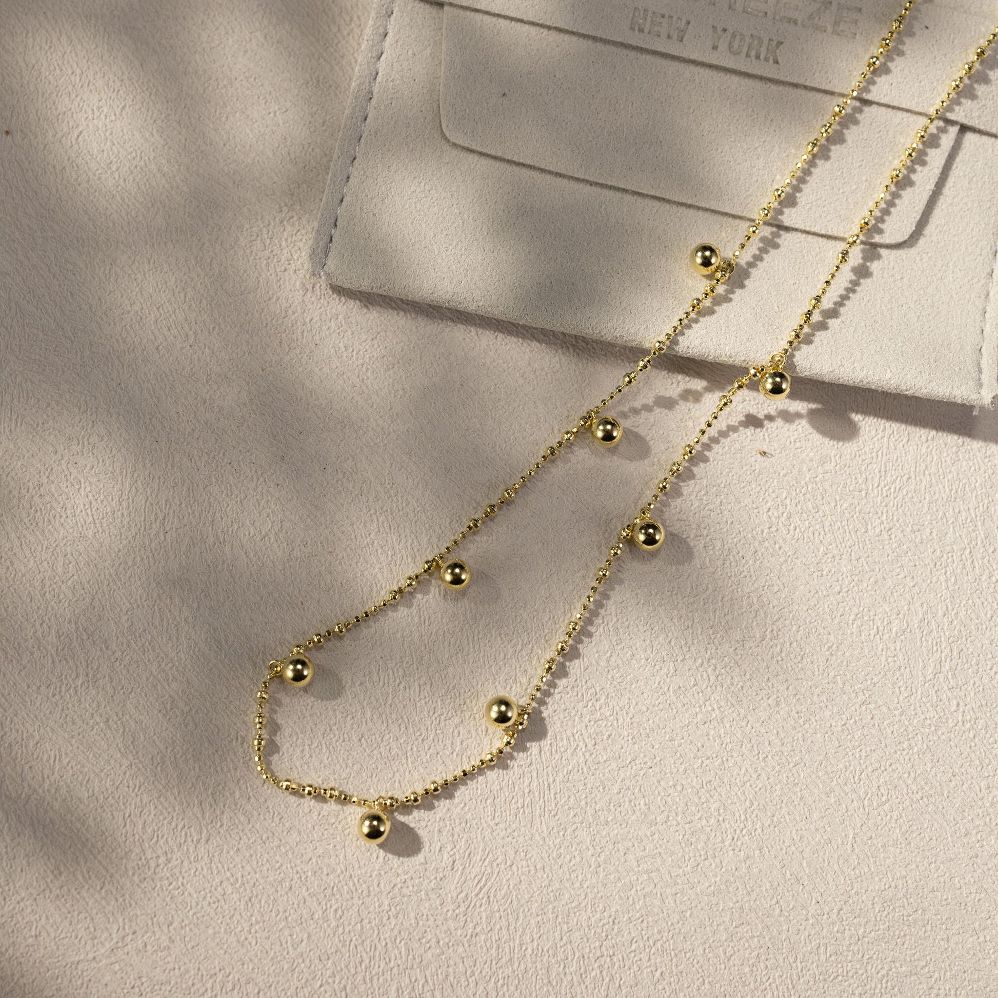 The Lyric necklace is a playful take on the classic bead chain, crafted in solid 925 sterling silver with a warm 14K gold vermeil finish. Scattered gold beads catch the light with every movement—perfect as a layering necklace to mix and match different looks, yet refined enough to wear solo every day.