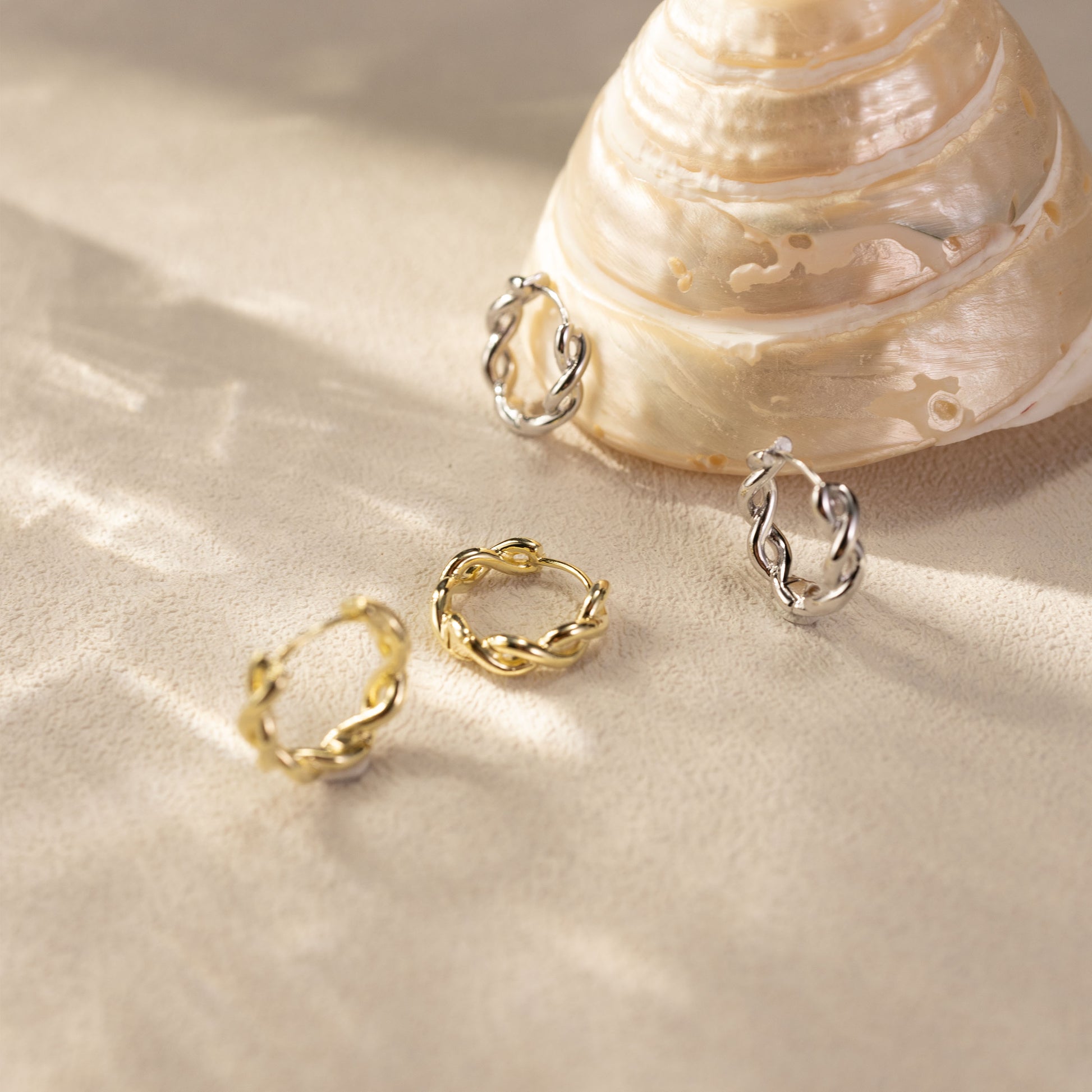 The Kiva huggies feature a twist design in solid 925 sterling silver with a luminous white-gold vermeil finish. These small hoops are designed for effortless everyday wear, with a classic twisted texture that adds subtle shine and dimension. Perfect for stacking or wearing solo, surprisingly lightweight.
